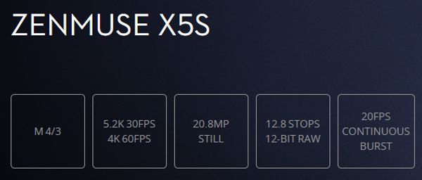 Equipped with an uprated Micro 4/3 sensor, the Zenmuse X5S has a dynamic range of 12.8 stops with a much improved signal to noise ratio